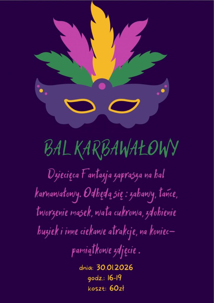 Bal Karnawałowy Dziecięcej Fantazji to doskonały pomysł na zimowe popołudnie pełne radości, kolorów i niezapomnianych emocji. Zachęcamy rodziców do zapisów i podarowania swoim dzieciom wyjątkowego karnawałowego przeżycia, które na długo pozostanie w ich pamięci.